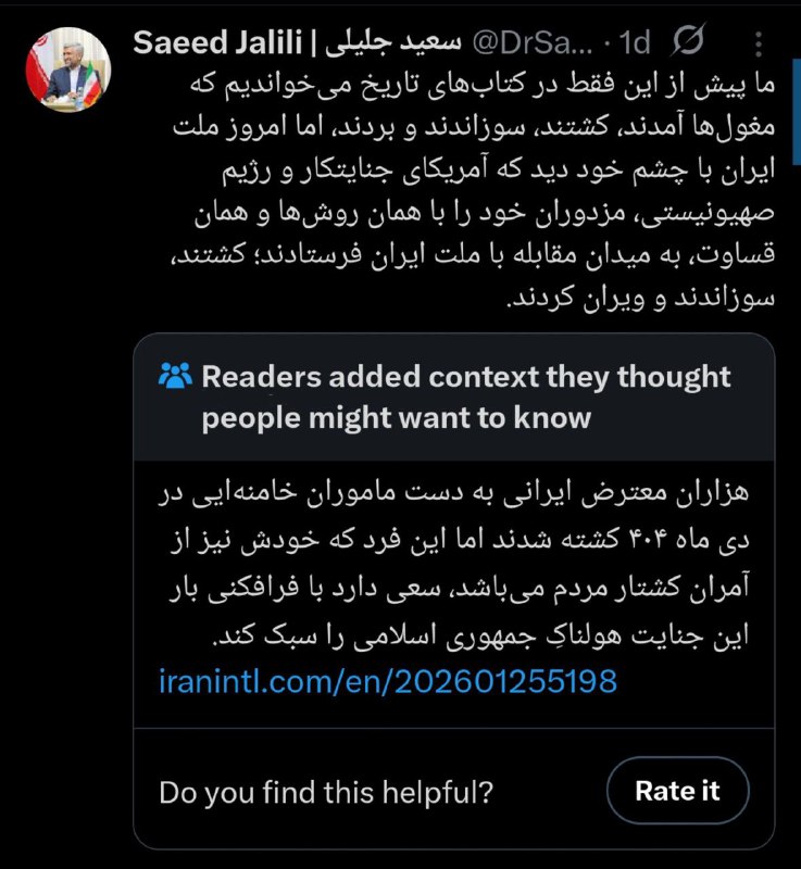 سعید جلیلی اومده توییت زده که ما مغول رو توی کتاب ها خوندیم، ولی جنایت رژیم صهیونسیتی و مزدوران رو به چشم دیدیم.