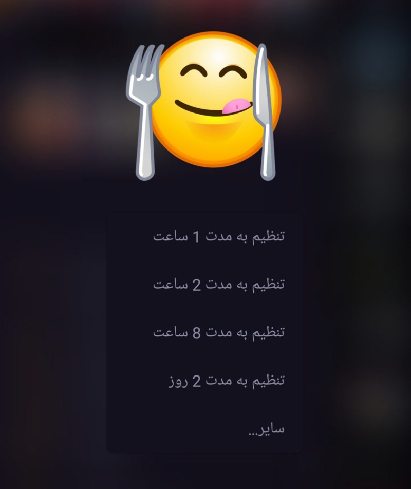 توی تنظیم ایموجی وضعیت اگه دستتان را روی ایموجی مورد نظر نگه دارید میتوانید زمان نماش آن را هم مشخص کنید. این گزینه برای مواقعی که قصد دارید برای یک بازه مشخص وضعیت پروفایلتان را نمایش دهید مناسب تر است. مثلاً وقتی قرار یک ساعت برید نهار بخورید یا چن