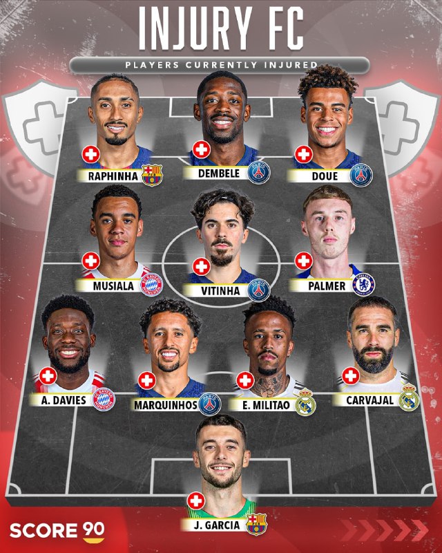 🔶 تیم منتخب مصدومان فعلی فصل ۲۶-۲۰۲۵؛ با حضور برنده توپ طلا، رافینیا و گارسیا