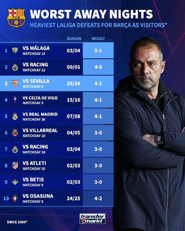 به بهانه شکست ۴-۱ مقابل سویا؛ 📊 سنگینترین شکستهای خارج از خانه بارسلونا در قرن ۲۱