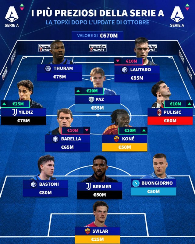 ۴ ستاره از اینتر، ۲ ستاره از یوونتوس ⚽️تیم منتخب ارزشمندترین بازیکنان سری آ در فصل ۲۶-۲۰۲۵