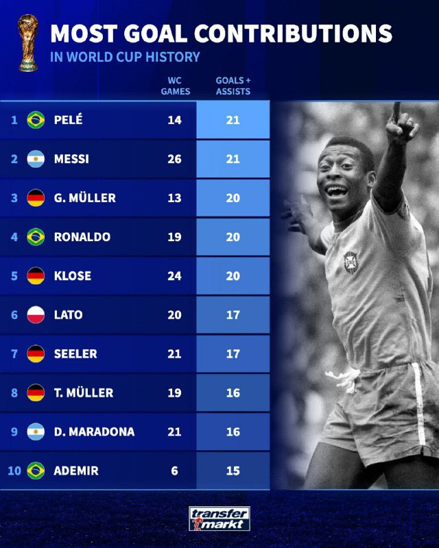 📊بازیکنان با بیشترین گل و پاس گل در تاریخ جام جهانی؛ دو پادشاه بالاتر از «مریخی»
