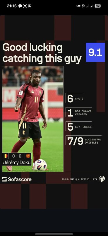 📊عملکرد فوقالعاده جرمی دوکو در ترکیب بلژیک