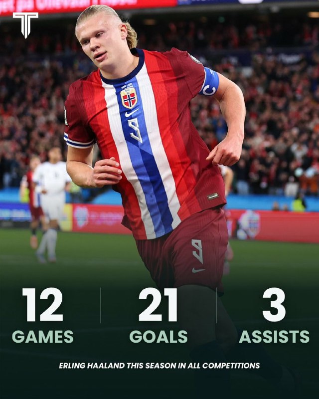 📊 عملکرد درخشان ارلینگ هالند در فصل جاری؛ 24 گل و پاس گل در 12 بازی