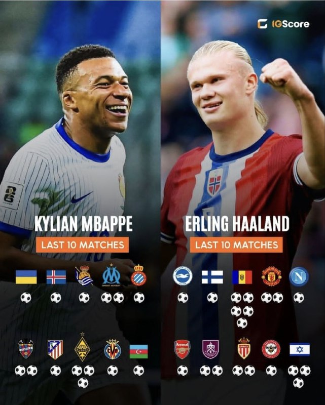 📊آمار خیره‌کننده گلزنی امباپه و هالند در ده بازی اخیر