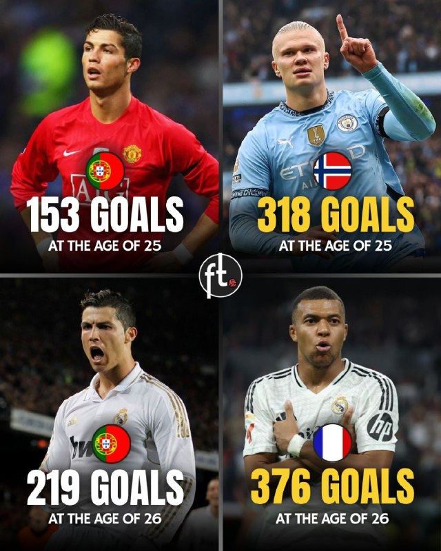 📊ارلینگ هالند و کیلیان امباپه هر دو تا این سن بیشتر از کریستیانو رونالدو گل زدهاند
