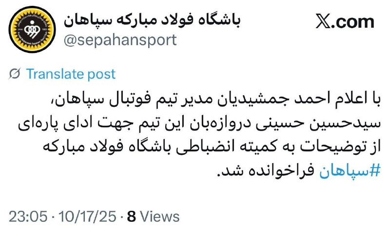 ❌️رسمی؛ حسین حسینی به کمیته انضباطی سپاهان احضار شد!