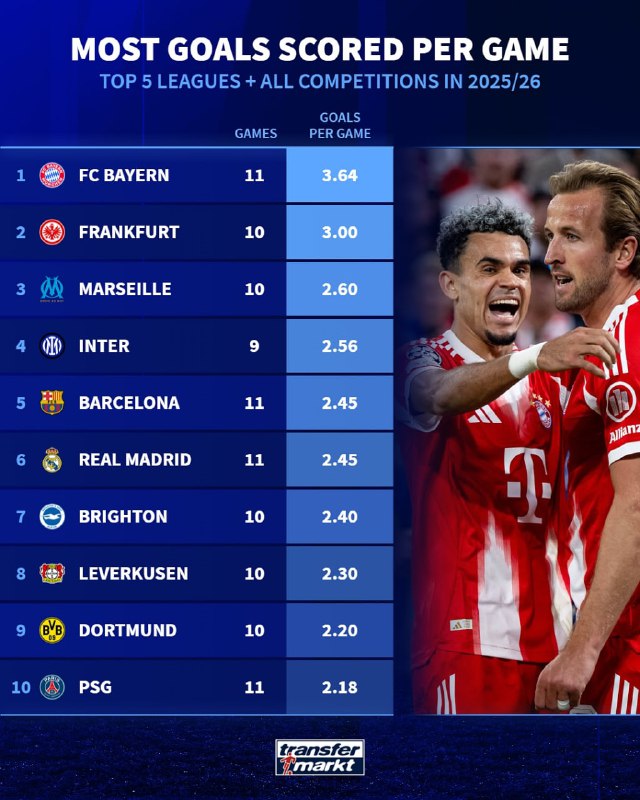 📊 چه تیمی بهترین میانگین گلزنی را در ۵ لیگ برتر اروپا به ثبت رسانده است؟