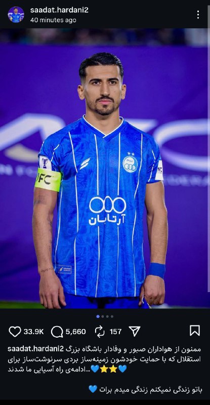 پست جدید کاپیتان استقلال پس از پیروزی برابر الوحدات 📲صالح حردانی: با تو زندگی نمیکنم، زندگی میدهم برایت!