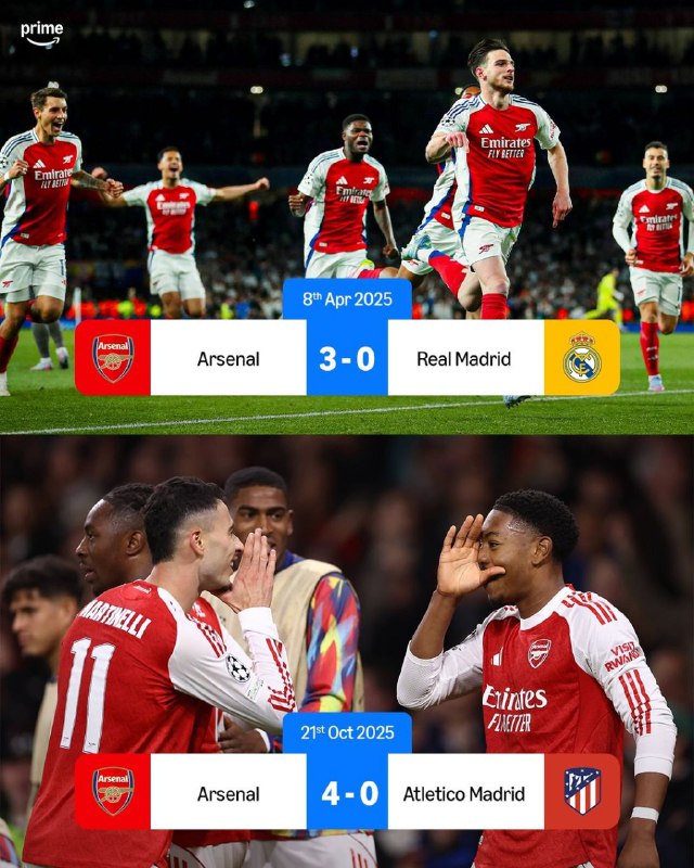 🔴⚡️آرسنال در سال ۲۰۲۵ و در ورزشگاه امارات، هر دو باشگاه مادریدی را شکست داده و آمار گل ۷-۰ را به ثبت رسانده است