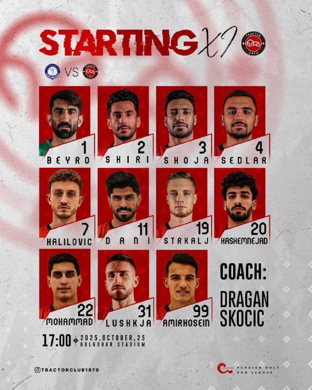 🏆 #لیگ_برتر | ترکیب تراکتور مقابل گل گهر / ساعت ۱۷:۰۰