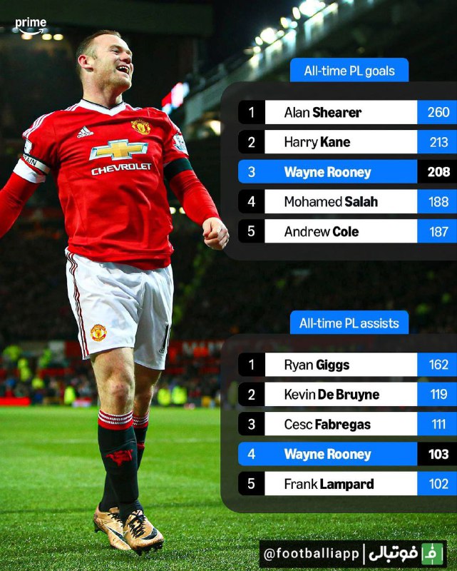 📊 وین رونی تنها بازیکن تاریخ لیگ برتر انگلیس با گلها و پاس گلهای سه رقمی