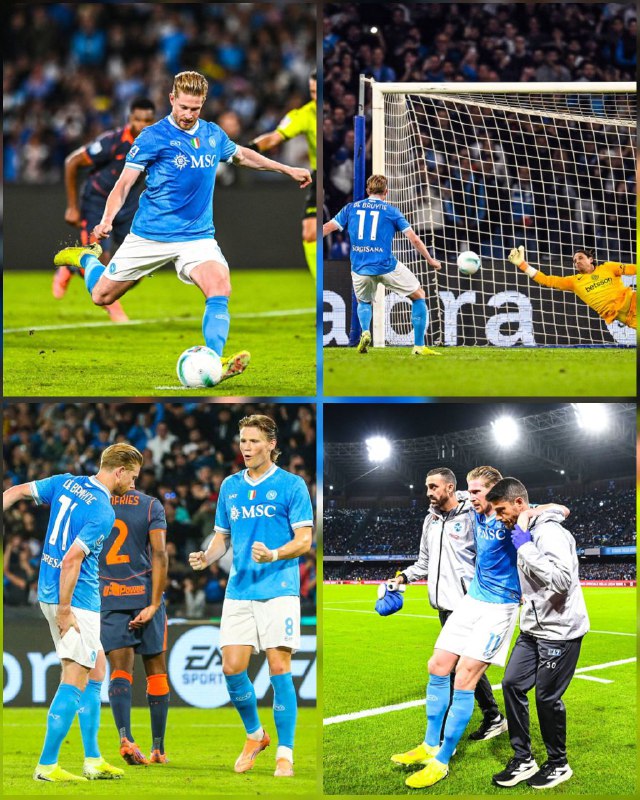 ناپولی با گل کوین دی بروین از روی نقطه پنالتی از حریف پیش افتاد، اما ستاره بلژیکی بلافاصله پس از زدن ضربه دچار آسیب همسترینگ شد و با اشک زمین را