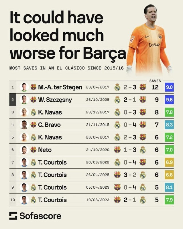 بررسی عملکرد دروازه‌بانان برتر در ال‌کلاسیکو از سال ۲۰۱۶ تاکنون نشان می‌دهد که وویچک شزنی با ۹ سیو، دومین گلر برتر از نظر تعداد مهار در یک دیدار است