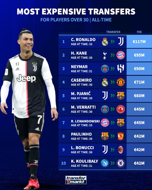 📊گران‌ترین نقل و انتقالات بازیکنان بالای 30 سال در تاریخ فوتبال