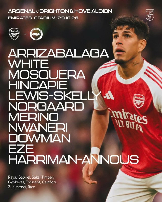 🏆 لیگ کاپ انگلیس | ترکیب آرسنال مقابل برایتون / ساعت ۲۳:۱۵