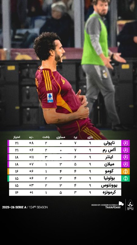 🔶 جدول سری آ در پایان هفته نهم؛ رم در یک قدمی صدر