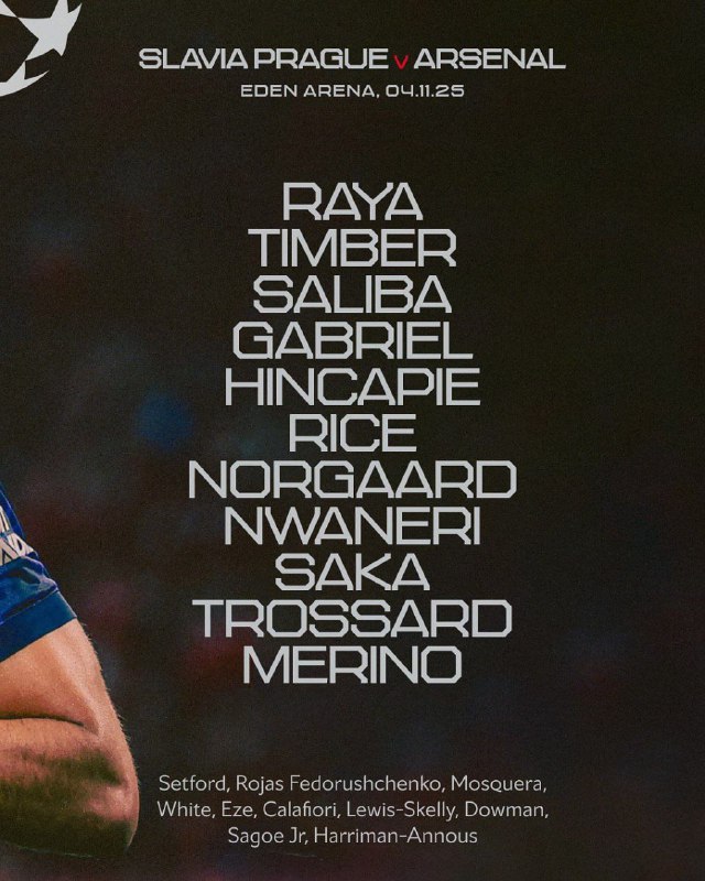 🏆 #لیگ_قهرمانان_اروپا | ترکیب آرسنال مقابل اسلاویا پراگ / ساعت: ۲۱:۱۵