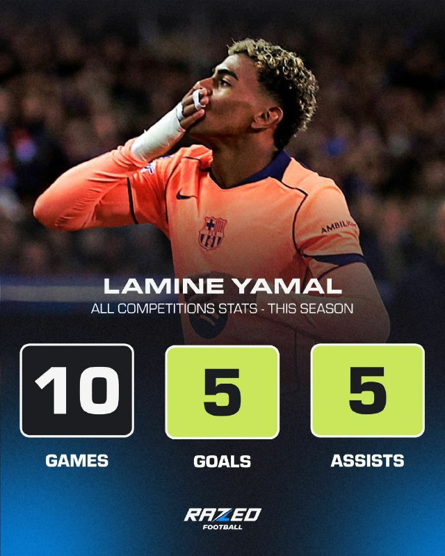 📊 عملکرد لامین یامال در فصل جاری؛ 5 گل و 5 پاس گل در 10 بازی