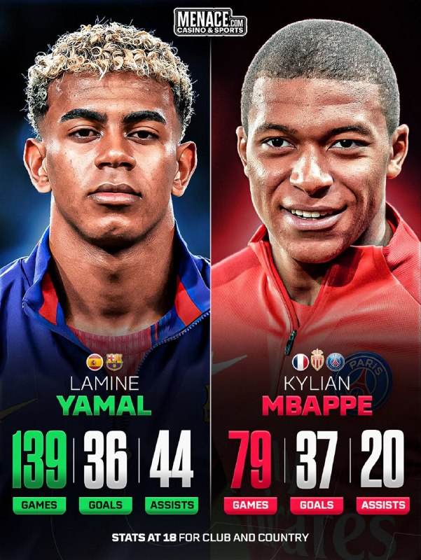 🤯🥶آمار دیوانهکننده لامین یامال در مقایسه با کیلیان امباپه در سن ۱۸ سالگی