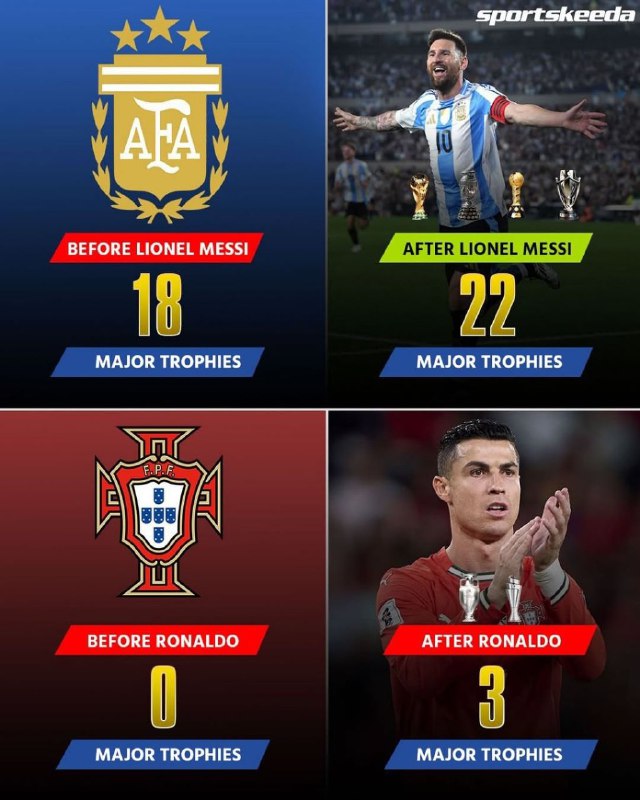 بررسی ادعای رونالدو 📊مقایسه قهرمانیهای آرژانتین و پرتغال پیش و پس از حضور مسی و رونالدو
