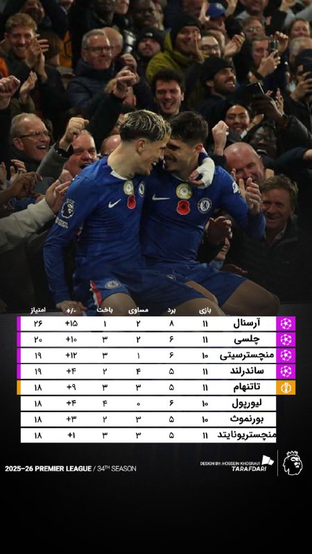 📊 خیال راحت آرسنال در صدر؛ چلسی به رده دوم رسید