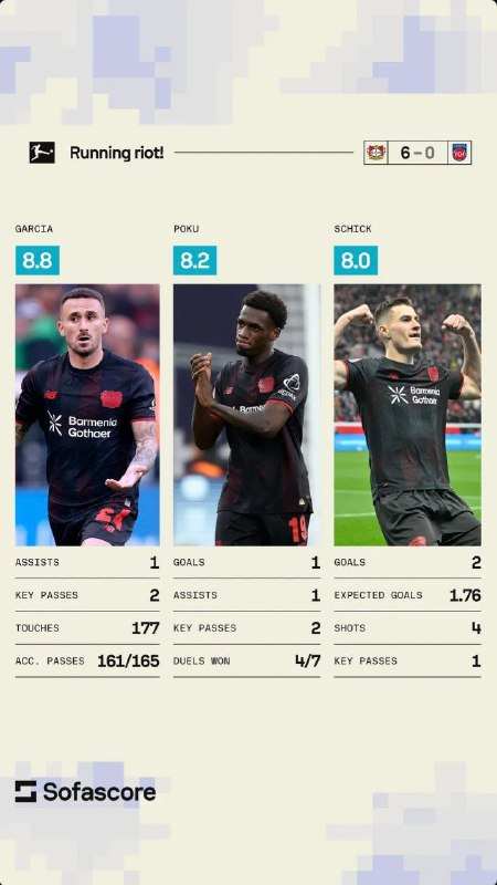 در شب پیروزی شش بر صفر لورکوزن مقابل هایدنهایم، پاتریک شیک ۲ گل به‌ثمر رساند، ارنست پوکو نیز ۱ گل و ۱ پاس گل و الکس گارسی