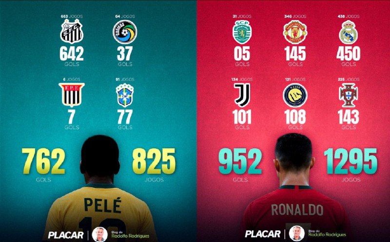 با احتساب گلهای ثبت شده در مسابقات غیررسمی، کریستیانو رونالدو ۲۰ گل بیشتر از پله دارد اما مجموع گلهای او در دوران حرفهای به ۹۷۲ میرسد. پله در مجموع ۱۲۸۲ گل در دوران بازیگری خود به ثمر رسانده که ۷۶۲ گ