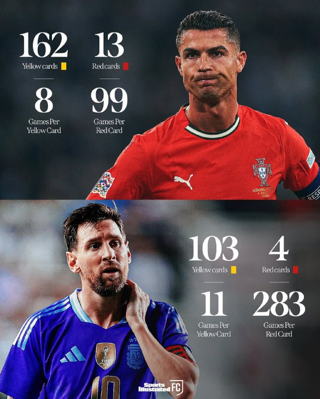 📊 مقایسه کارت‌های زرد و قرمز کریستیانو رونالدو و لیونل مسی
