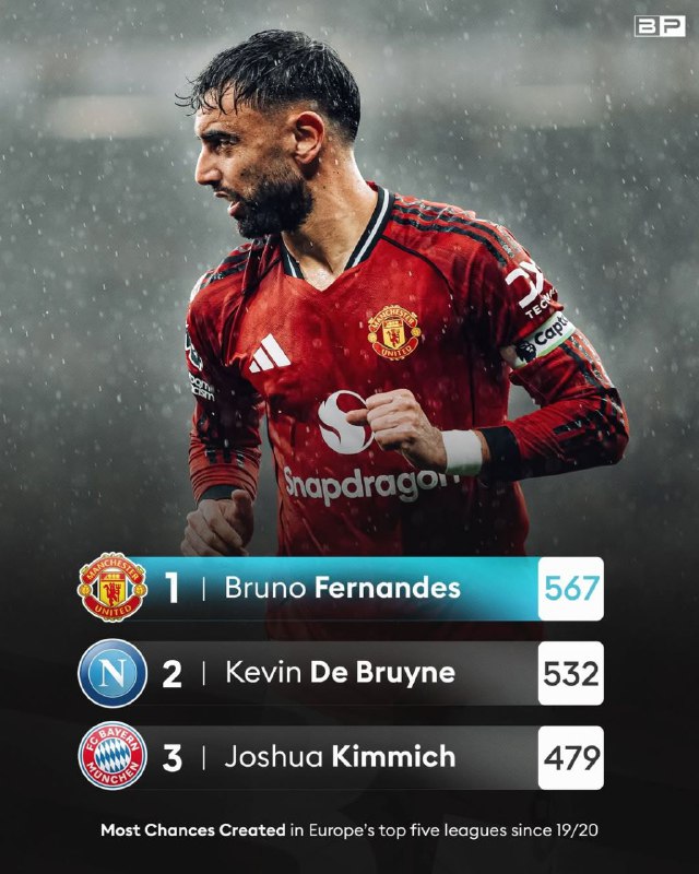 برونو فرناندز از منچستریونایتد از فصل ۲۰۲۰-۲۰۱۹ تا کنون، با ۵۶۷ موقعیت خلق شده در تنها ۲۰۶ بازی، دارای بیشترین آمار موقعیت‌سازی در ۵ لیگ معتبر اروپا است!