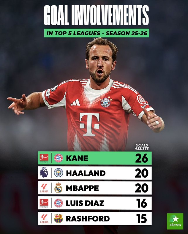 🚨📊بهترین بازیکنان ۵ لیگ معتبر اروپایی از نظر آمار گل و پاس گل