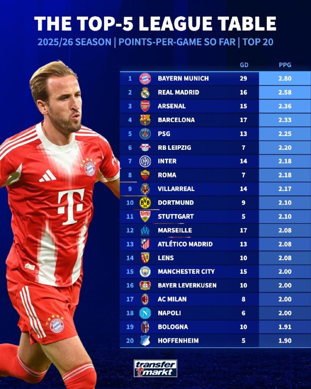 📊 رده‌بندی تیم‌های پنج لیگ معتبر بر اساس میانگین امتیاز