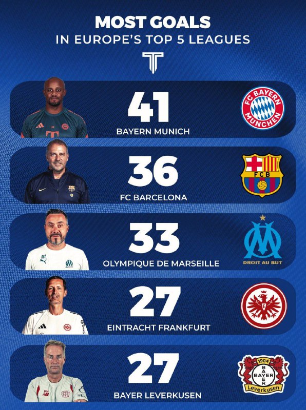 ⚽️📊گلزنترین تیمهای پنج لیگ معتبر اروپایی از ابتدای فصل ۲۶-۲۰۲۵
