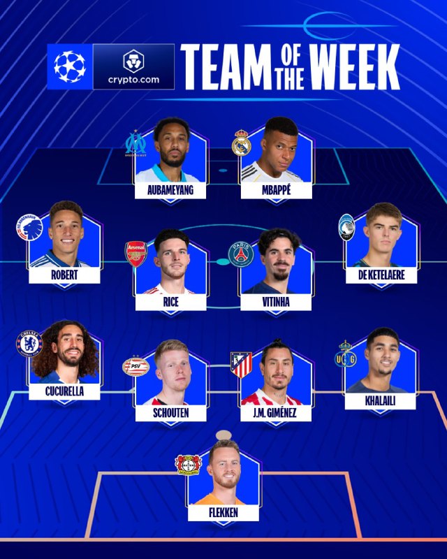 یوفا دقایقی پیش تیم منتخب هفته پنجم لیگ قهرمانان را اعلام کرد؛ نکته جالب اینکه هر ۱۱ بازیکن از ۱۱ تیم مختلف انتخاب شده‌اند.