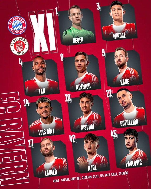 🏆 #بوندسلیگا | ترکیب بایرن مونیخ مقابل سن پائولی / ساعت 18:00