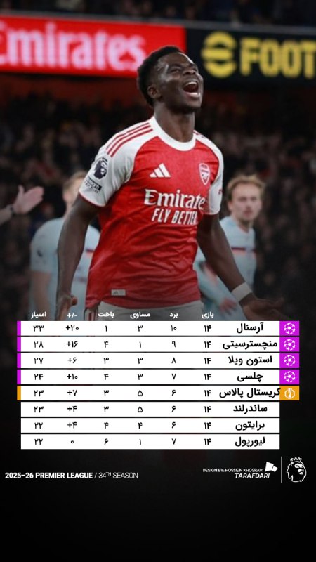 📊 وضعیت جدول لیگ برتر انگلیس؛ آرسنال دور از دسترس