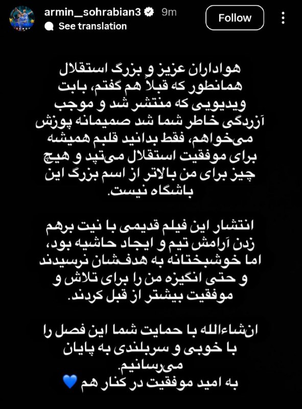 📱آرمین سهرابیان: آن فیلم را با هدف برهمزدن نظم تیم منتشر کردند اما ناموفق بودند؛ قلبم برای استقلال میتپد