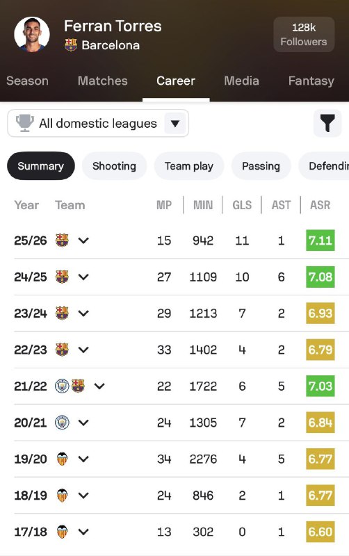 📊 فران تورس برای اولین بار موفق به ثبت بیش از 10 گل در طول یک فصل لیگهای داخلی شد