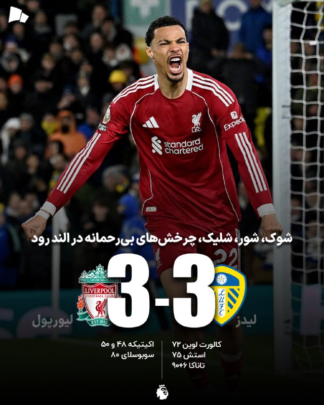گل تساویبخش آئو تاناکا به لیورپول در دقیقه 6+90 (لیدز یونایتد 3_3 لیورپول)
