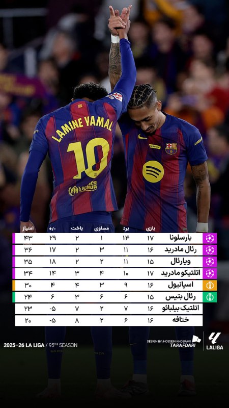 📊 جدول لالیگا؛ بارسلونا به سقف چسبید؛ اتلتیکو همچنان چهارم