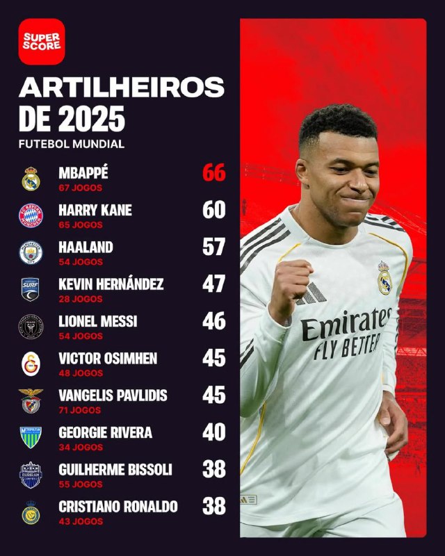 در لیستی که صفحه سوپراسکور منتشر کرده، کیلیان امباپه با ۶۶ گل در ۶۸ بازی در سال ۲۰۱۵ بهترین گلزن این سال لقب میگیرد، پس از او هری کین و ارلینگ هالند حضور دارند