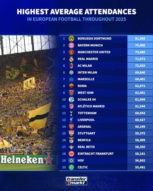 آرسنال چهاردهم، رئال مادرید چهارم 👥پرتماشاگرترین باشگاههای اروپا در سال ۲۰۲۵