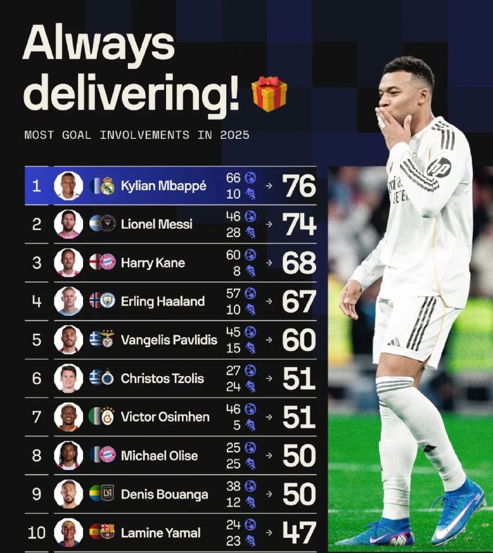 📊 10 بازیکن با بیشترین مشارکت گل در سال 2025؛ کیلیان امباپه بالاتر از لیونل مسی و هری کین