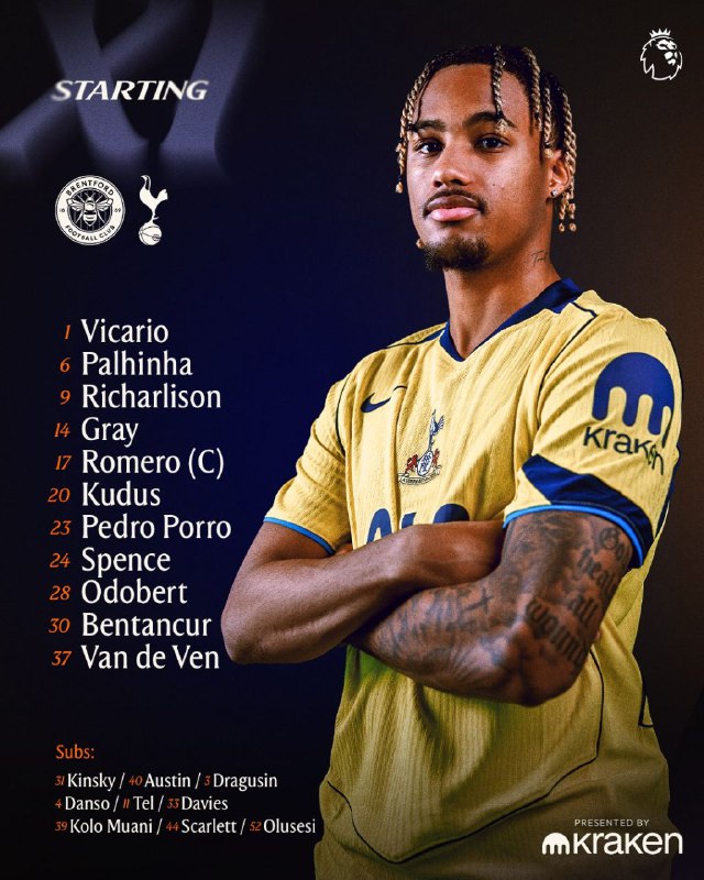 🏆 #لیگ_برتر_انگلیس | ترکیب تاتنهام مقابل برنتفورد / ساعت ۲۳:۳۰