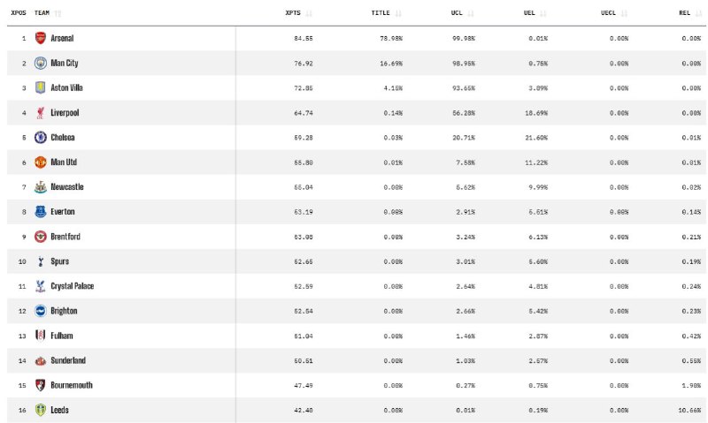 👀شانسهای قهرمانی لیگ برتر انگلیس از نگاه اوپتا؛ آرسنال بیش از 500 برابرِ لیورپول