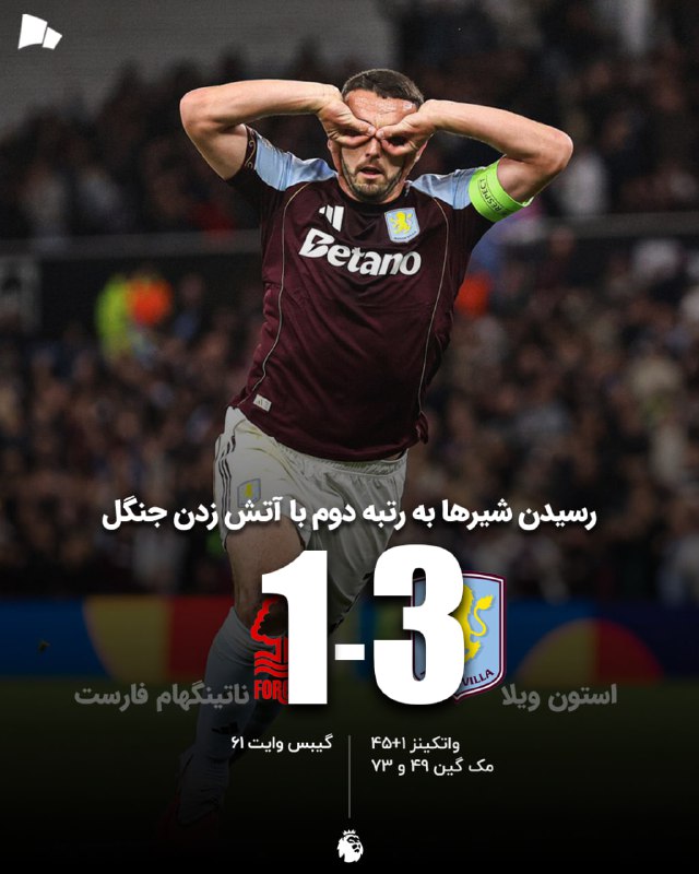 🏆 #لیگ_برتر_انگلیس | استون ویلا 3_1 ناتینگهام فارست / رسیدن شیرها به رتبه دوم با آتش زدن جنگل