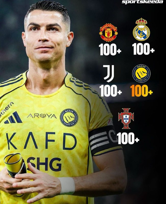 کریستیانو رونالدو تنها بازیکنی در تاریخ است که توانسته برای پنج باشگاه مختلف، بیش از ۱۰۰ گل به ثمر برساند
