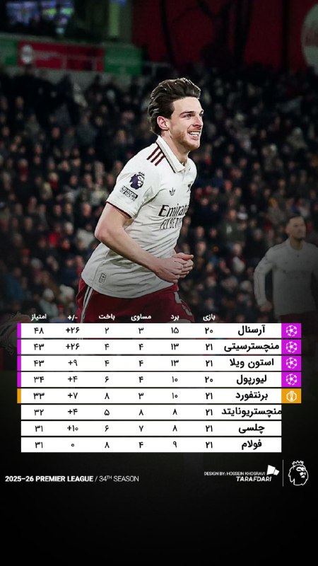 📊 وضعیت جدول لیگ برتر انگلیس؛ همه چیز به کام توپچیها