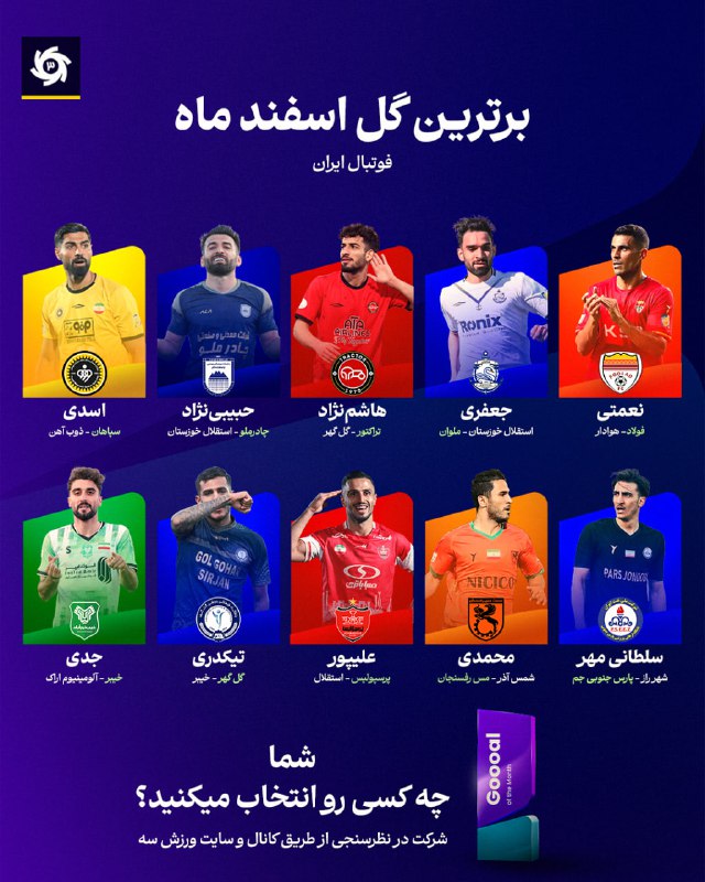 ⬇️به نظر شما کدام یک از این 10 گل، بهترین گل مسابقات اسفند ماه فوتبال ایران بوده است؟ در صفحه اصلی ورزش سه در نظرسنجی بزرگ ما شرکت کنید و به گزینه خود رای دهید.