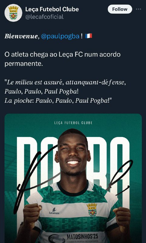 ✔️باشگاه لسا تیم دسته چهارم پرتغال با انتشار دو تصویر خبر از پیوستن پل پوگبا ستاره فرانسوی به این تیم داد!
